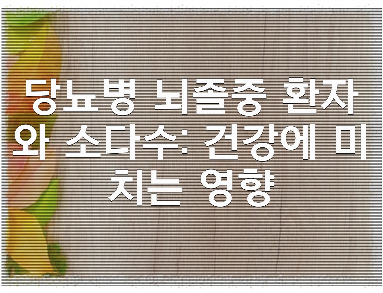 당뇨병은 전 세계적으로 만연한 만성 질환으로, 높은 혈당 수치와 관련된 합병증으로 인해 심각한 건강 문제를 일으킬 수 있습니다. 뇌졸중은 당뇨병 환자에게 주요 사망 원인 중 하나이며, 혈관 손상과 혈전 형성으로 인해 발생합니다. 자~ 그럼, 당뇨병 뇌졸중 환자와 소다수: 건강에 미치는 영향 써머리 합니다.