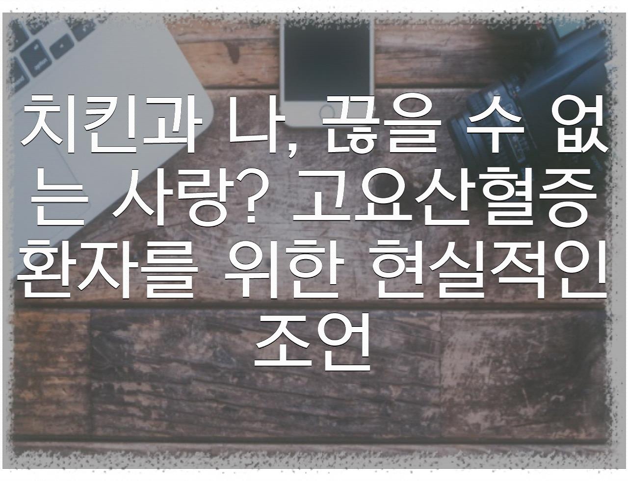 "치킨 없이 살 수 없어~" 누구나 한 번쯤 외친 적이 있는 이 말은 바로 저를 위한 듯합니다. 매콤한 양념에 바삭한 튀김옷을 입힌 치킨 한 입 베어 물면 세상 모든 걱정이 사라지는 것 같죠. 하지만 저에게는 치킨과의 사랑에 작지만도 큰 걸림돌이 존재합니다. 바로 고요산혈증입니다. 자~ 그럼, 치킨과 나, 끊을 수 없는 사랑? 고요산혈증 환자를 위한 현실적인 조언 써머리 합니다.